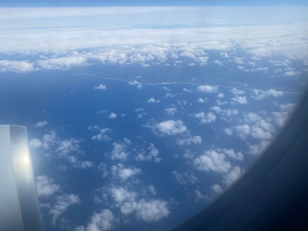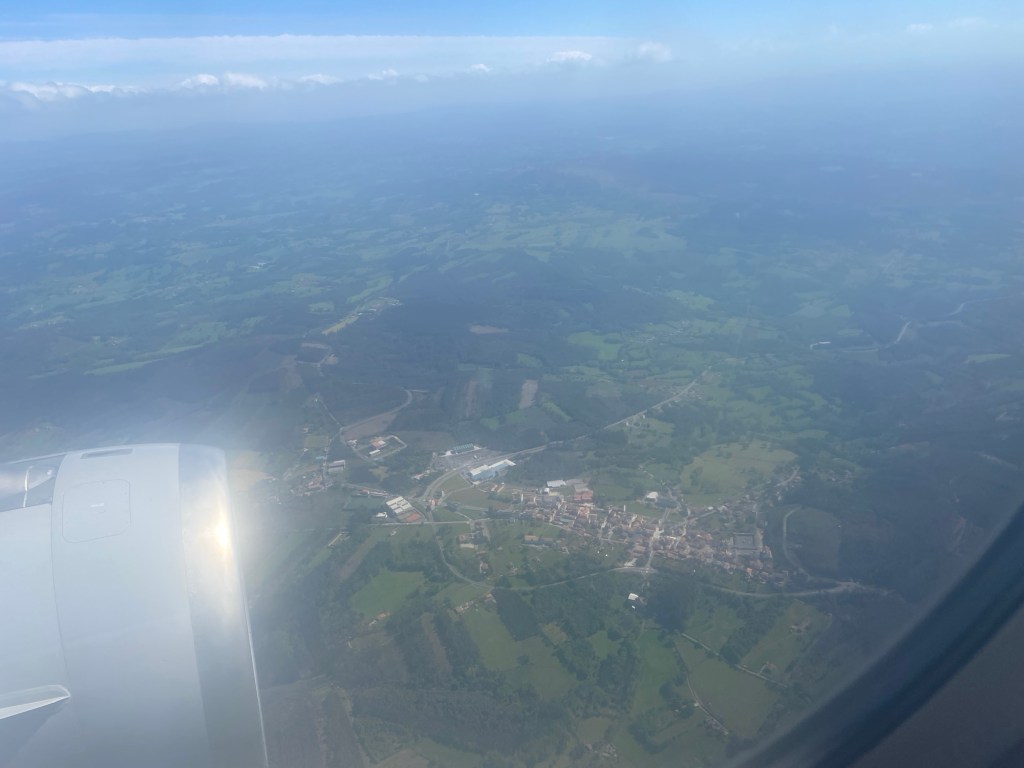 Unter mir liegt die Küste von Spanien. Ich denke das ist schon Galizien. Die Küste ist wild zerklüftet und weiße Wolken ziehen drüber hinweg. Die Anreise war bisher völlig problemlos angenehm und wir kommen dem Ziel immer näher.