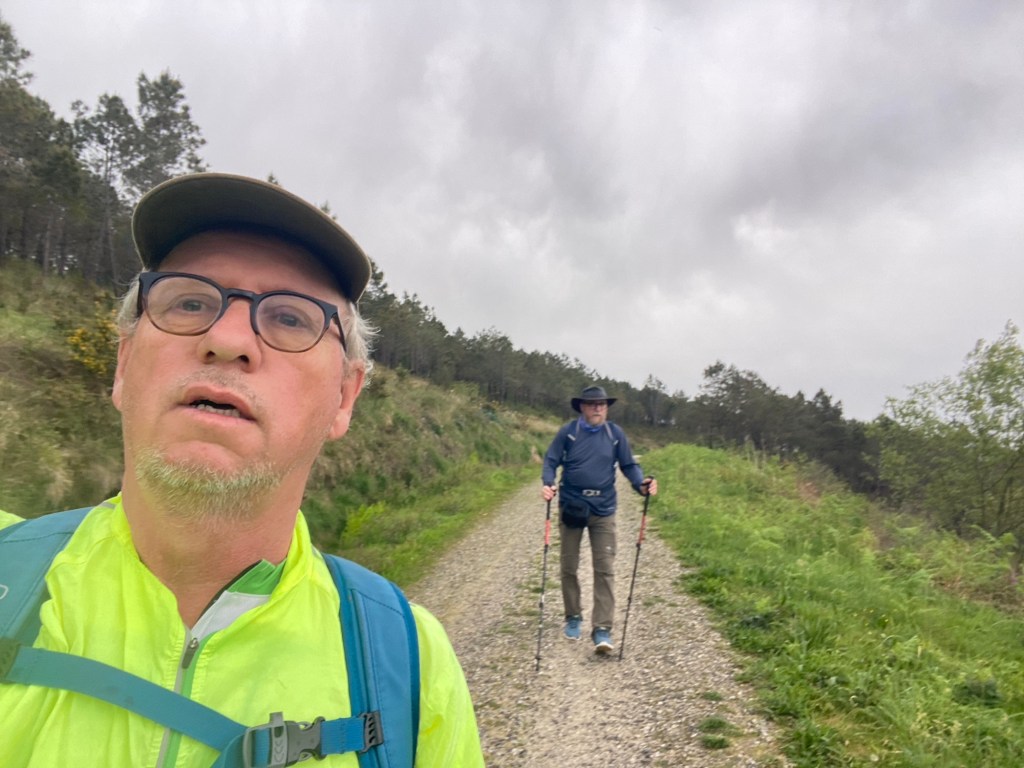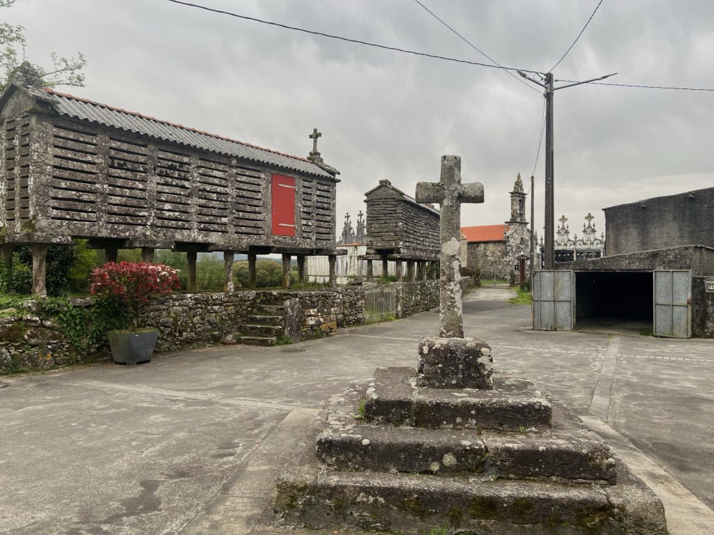 Beim Verlassen von Oliveira blickten wir noch einmal auf die Kirche und die Horreos und wanderten abwechselnd auf Waldschotterwegen und Landstraßen Richtung A Grixa.
