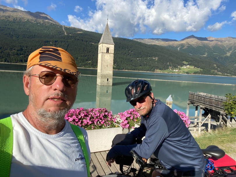 Wir starteten von Reschen aus und schossen unser erstes Foto natürlich am aus dem Reschensee ragenden Kirchturm, der Bildikone schlechthin in dieser Region.