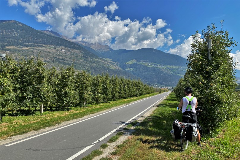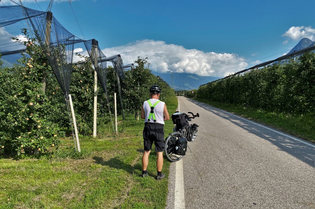 Der Radweg war breit, gut ausgebaut und asphaltiert, solange wir im Tal fuhren. Mussten wir aber der Via Claudia Augusta folgend den Radweg Merano – Bozen verlassen, dann ging es oft auf schmaleren Wegen und auch auf Kies weiter, aber immer vorbei an den endlosen Apfelplantagen.