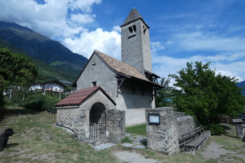 Wir folgten weiter der Via Claudia Augusta und machten einen Zwischenstopp in Naturns. Hier fanden wir, eingebettet in die in der Talsohle vorherrschenden Apfelgärten, die kleine Kirche St. Prokolus.