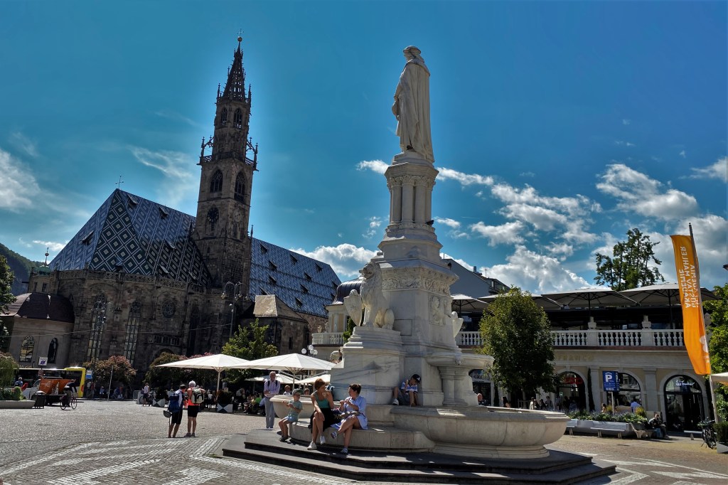 Danach ging es zur Piazza Walther, dem berühmten Waltherplatz, der sich ebenfalls im Zentrum der Südtiroler Landeshauptstadt befindet. Seinen Namen verdankt er dem Dichter Walther von der Vogelweide, dem das von Heinrich Natter aus Laaser Marmor geschaffene Walther-Denkmal auf der Mitte des Platzes gewidmet ist. Der Waltherplatz gilt als einer der markantesten Punkte und als gesellschaftliches Zentrum der Stadt.
