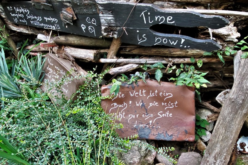 Schon beim Einstieg stießen wir auf Kunst und Krempel – eine kreative Person hatte Spruchweisheiten auf Alltagsgegenständen am Wegesrand zur Schau gestellt, eine originelle Idee.