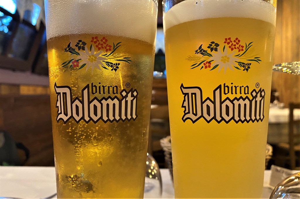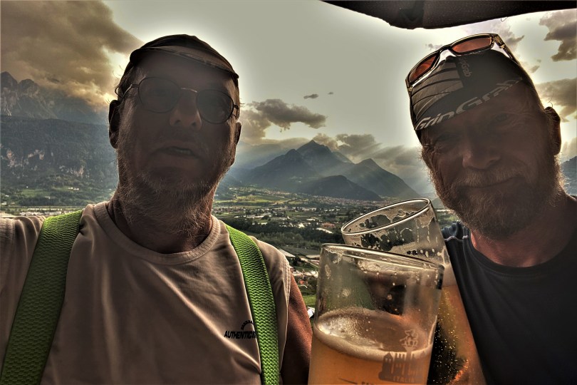 Oben am Hotel angekommen, genossen wir den Ausblick auf die ??? , ja worauf? Das Begrüßungsbier gab uns die Antwort – auf die Dolomiten.