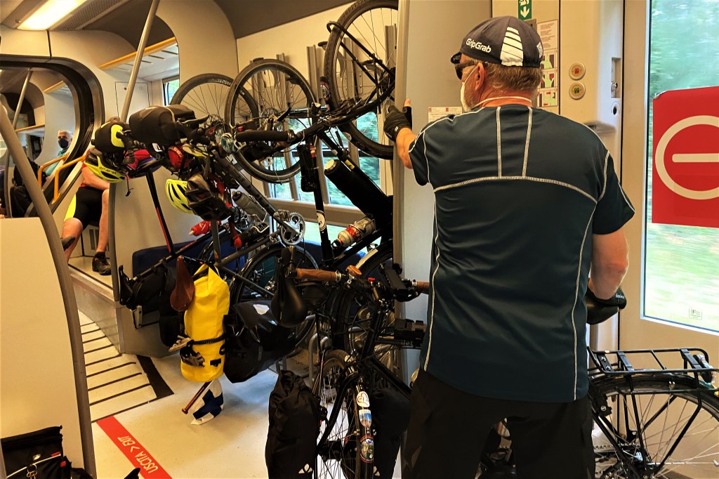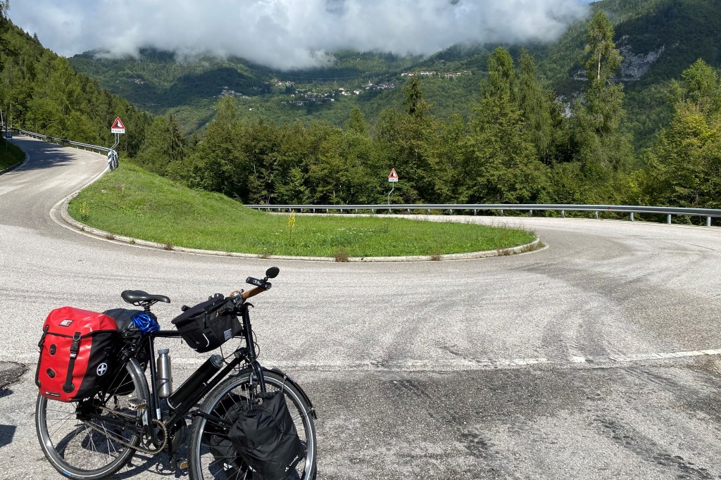 Die 17. Etappe begann mit einer Zugfahrt von Trento nach Pergine Valsugana, welche sich etwas schwierig gestaltete, da es nicht einfach war, unsere vollbepackten Räder in den Eisenbahnwagen zu hieven. Weil in italienischen Zügen die Räder hochkant stehend befestigt werden müssen, hieß es alle Taschen abnehmen. Nach 5 Stationen mussten wir sehen, wie wir möglichst schnell unsere Räder und unsere ganzen Fahrradtaschen ohne Verluste aus dem Zug bekommen.