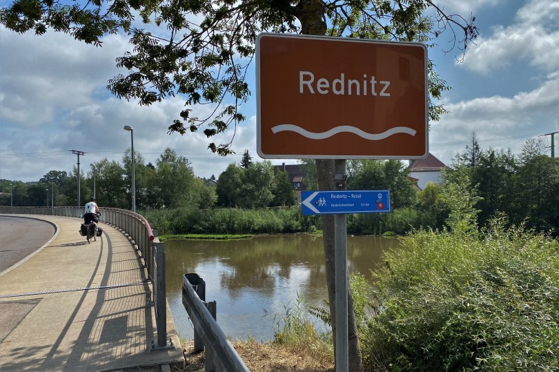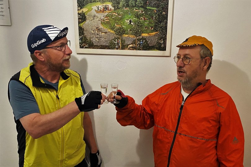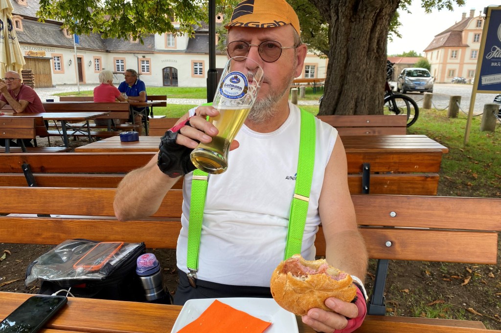 Auf Prost geht’s los 19.8.2022 Als uns der Starkregen am Donnerstagmorgen den Etappenstart verzögerte, wollte uns der freundliche Wirt zu einem Bier einladen, um die Wartezeit zu verkürzen. Wir lehnten dankend ab, mussten aber letztendlich wenigstens mit einem kleinen edlen Tropfen anstoßen. Nach einem reichhaltigen Frühstück ging es von Coburg nach Bamberg, 51,3 Km, 130 Höhenmeter, 2h 43 Fahrzeit. Der Radweg war gut ausgebaut, durchgehend asphaltiert und so fuhren wir tiefenentspannt Richtung Bamberg, vorbei an der Großheirather Taufallee.