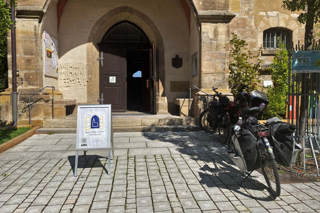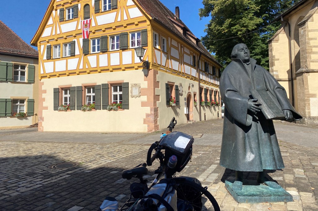 Erstaunlich viele offene Kirchen boten uns eine Möglichkeit zur Besichtigung, zum Gebet und zum Entzünden einer Kerze, so z.B. in Pfaffenhofen und in der Stadtpfarrkirche “Zu unserer Lieben Frau” in Roth. Überall trafen wir auf Luther, mal grüßte er von der Wand, mal waren Sprüche von ihm zu lesen und dann wieder ein Luther vor der Kirche.