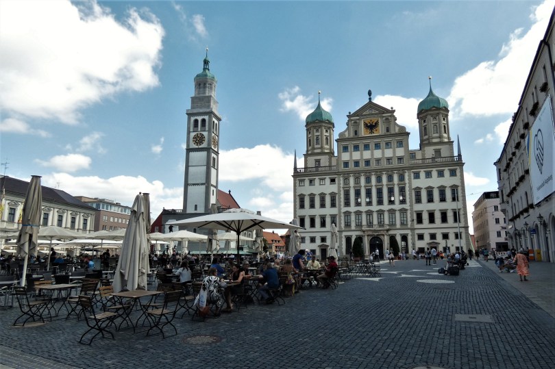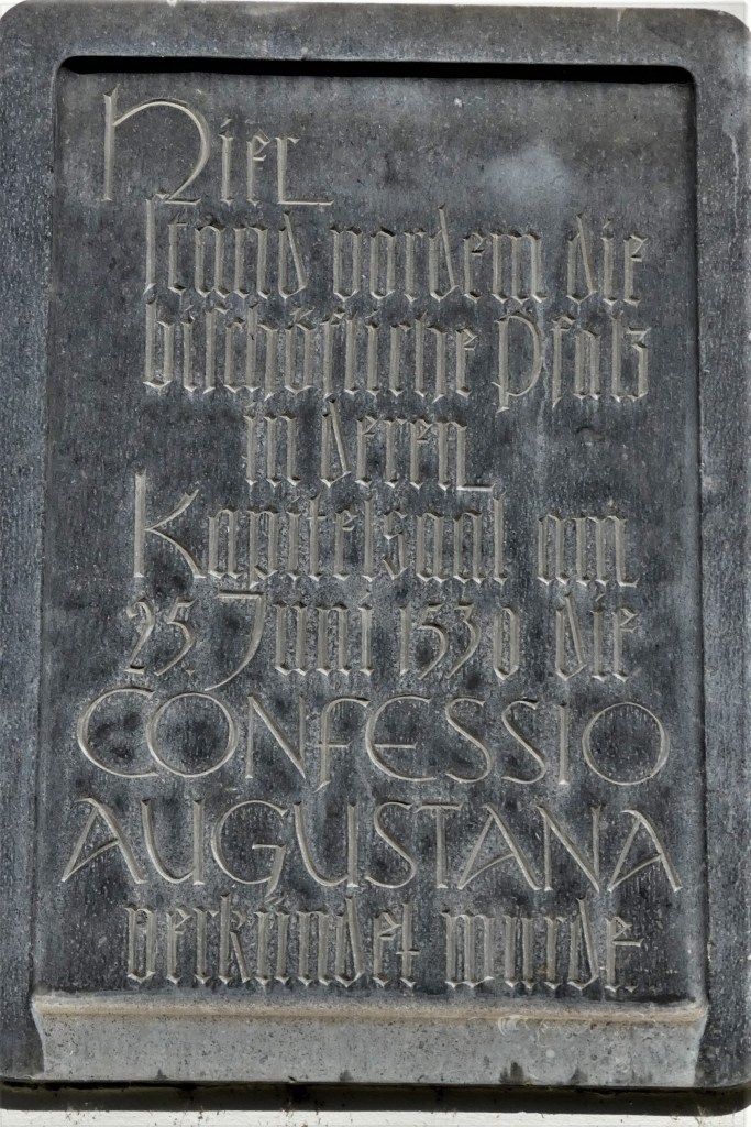 Über den südlichen Domvorplatz führte uns der Weg zur ehemaligen bischöflichen Residenz. In ihrem Vorgängerbau wurde 1530 die “Confessio Augustana” verlesen. Eine Gedenktafel an der barocken Fassade erinnert daran. Der schlanke Pfalzturm darüber ist das letzte Relikt aus dieser Zeit.