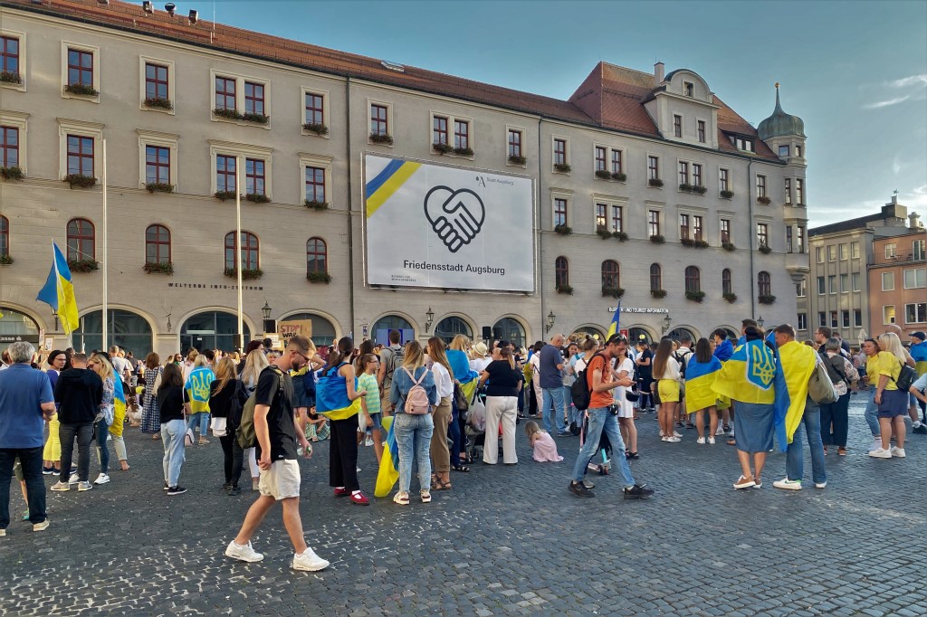 Jedes Jahr am 8.August wird seit 1650 das Augsburger Hohe Friedensfest in der Stadt begangen. Ursprünglich dankten die Augsburger Protestanten mit dem Fest für die Erhaltung des Glaubens und für das Ende der Unterdrückung. Heute ist das Friedensfest ein interreligiöses Fest, bei dem sich alle Glaubensrichtungen mit dem Friedensgedanken auseinandersetzen können. Seit 1950 ist dieser Tag in Augsburg ein gesetzlicher Feiertag. Heute trafen sich hier auf dem zentralen Platz die Ukrainer zum Gedenken an ihren Unabhängigkeitstag.