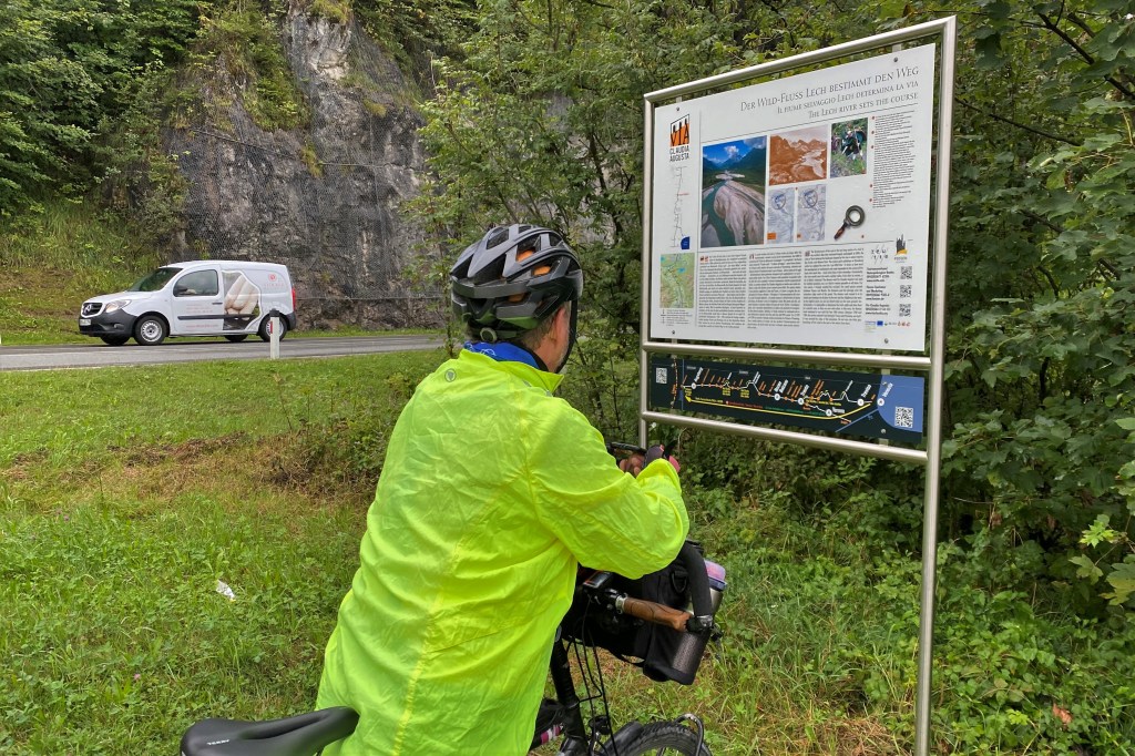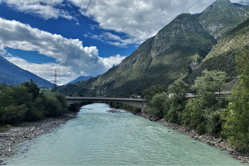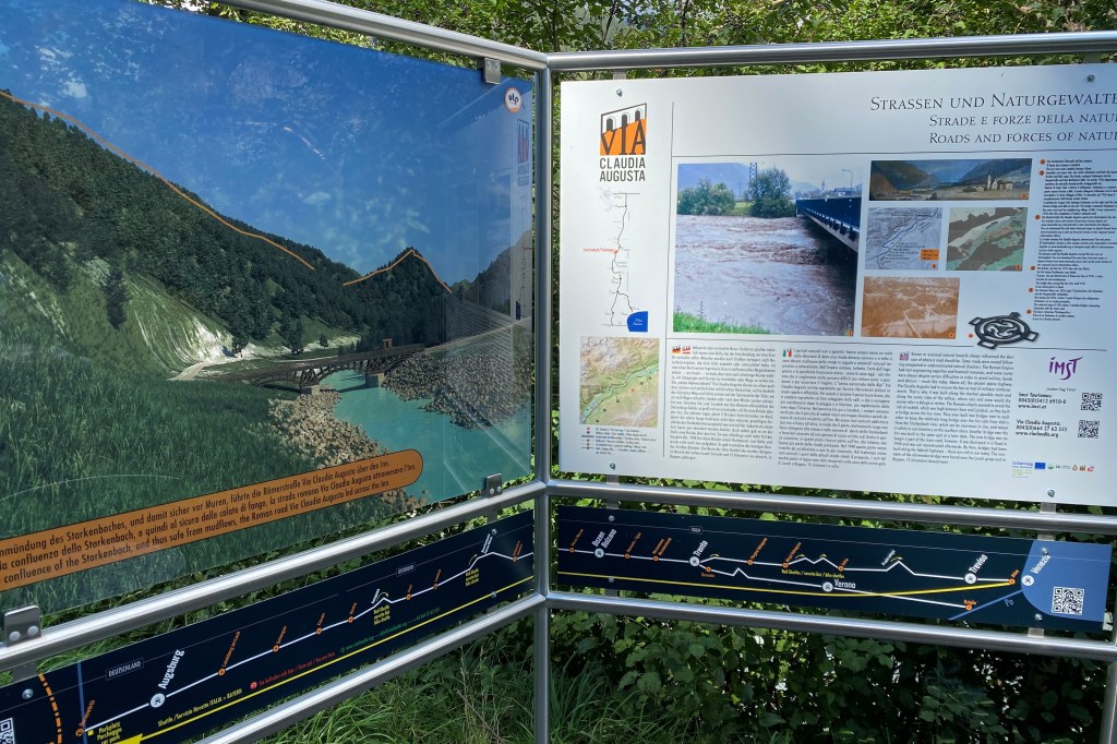 Diesmal hatten wir genügend Zeit, um all die Schautafeln zu studieren, die in regelmäßigen Abständen Informationen über die Kaiserstraße an die Radtouristen geben. Die antike Alpenautobahn führte primär auf der Sonnenseite der Täler entlang. Wenn aber für die Römer die Steinschlaggefahr zu groß war, entschieden sie sich für eine Brücke über den Inn.