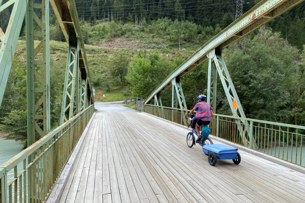 So mussten auch wir den Inn mehrmals überqueren, immer der Via Claudia Augusta folgend. Dabei trafen wir auf einen australischen Radtouristen, der von Paris kommend auf einem Klapprad mit selbstgebautem Kofferanhänger durch das Oberinntal radelte – sein Ziel – Rom. Wir sind also nicht die einzigen “Verrückten” auf der Via Claudia Augusta.
